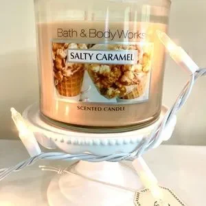 Bath and Body Works 3-wick candle in the scent Salty Caramel. Creamy tan wax. Never burned. Pedestal not included. Price firm.