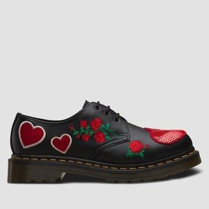 This is our classic 3 eye shoe. The second style that Dr. Martens made, the shoe was crafted for industry — and made rebellious by generations of non-conformists. This season, we gave it a Valentine remix, with heart-shaped appliques, rose embroidery and a sequin heart on the toe.