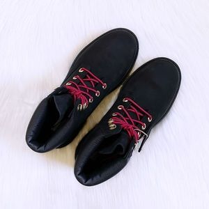 New In Box- Timberland Women’s Heritage 6 Inch Waterproof Boots In Black Nubuck Leather With Red Laces, Padded Collars, Seam-Sealed Construction, 200g PrimaLoft Insulation And Rubber Lug Outsoles.