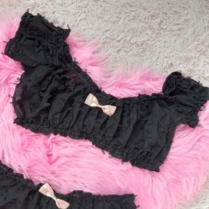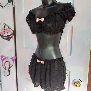 this suuuuper sexxxy lingerie set from dolls kill is sheer yet textured, off shoulder feeme crop top with baby pink how, matching baby pink bow on cute sexy kawaii Lil bloomers! panties are also textured. view pics carefully as they serve as part of the description! tags were removed and tried on w my own own panties on, so it's still new just without tags! so cute! surprise your lover this weekend w this sexy Lolita baby-girl sugar pie set!