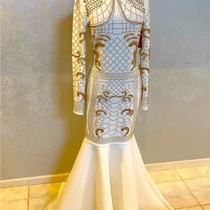 White formal mermaid style dress hand beaded with gold beads white quality knit fabric