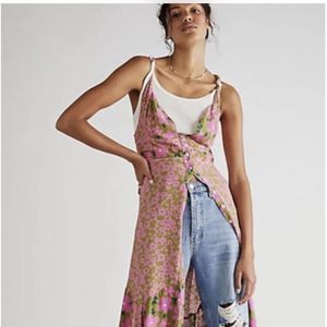 Free People Dewberry Floral Maxi Dress Printed Button Up Back Cross Strap Pink Olive