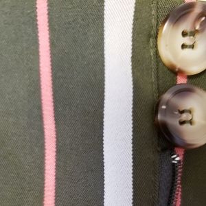 The perfect shade dark olive green (looks like a dark bronze/gray), pink & white stripes shorts by Lumeire. High waist, 2 button closure & belted. Very classy shorts that can wear casual or dressed up like a miniskirt w/ heels. Has some stretch, extremely soft to the touch & durable & made for high rotation daily wear. 100% Polyester. Laying flat measurements 13 1/2" waist & 15 1/2 length. Worn only twice so absolutely no signs of wear. A must have