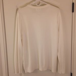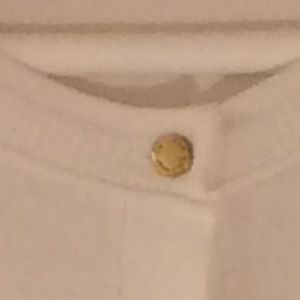 Nice little summer cardigan in a creamy white rayon/nylon blend with small golden buttons. Does not cling. Can be tied around shoulders as shown. Excellent condition, no stains or snags.