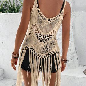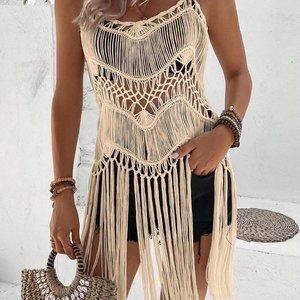 Apricot Boho Womens Hollow Out Fringe Hem Crochet Cover Up