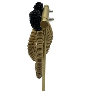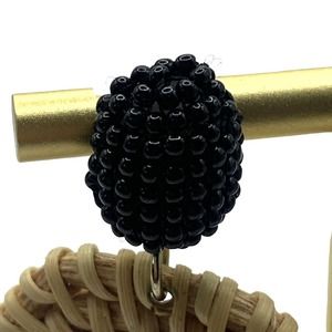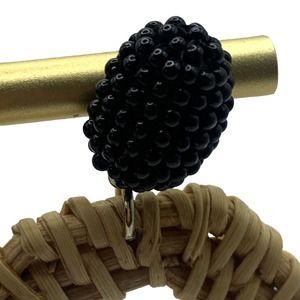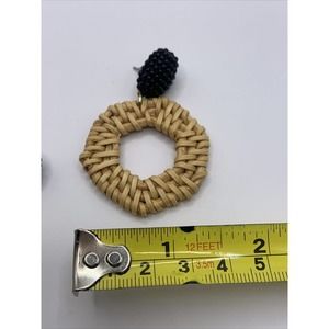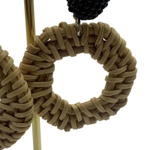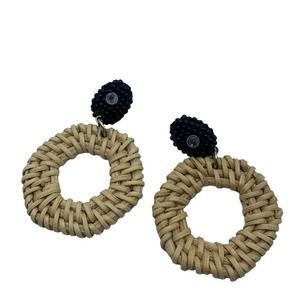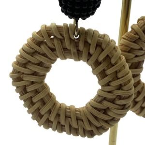 Rattan Dangle Hoop Earrings Boho Beaded Straw Wicker Braided Woven Earrings Tan with black beading. plastic back. excellent condition