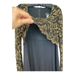 Vintage style black and gold long sleeve full length gown with gold floral mesh overlay shirt with scalloped hemline. Sleeves are sheer/unlined. Size 16 womens.