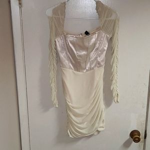 Windsor bodycon dress with mesh sleeves. satin corset bodice.