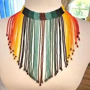 Hand Beaded Red, Orange, Gold, Yellow, Black, Dark Green, Turquoise, Teal and Brown Seed Beads. Long Fringe Styled Strands Accented with Brass Beads.