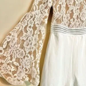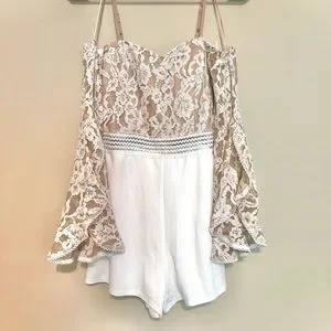New without tags Fashion Nova romper in white and nude with lace details. The romper has bra padding and adjustable straps. The back has a zipper closure. The bottom has a polyester lining inside as well.