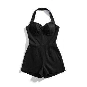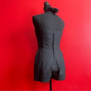 Handmade custom playsuit / romper with a detachable sarong-style knee skirt, pockets and a daring slit. Designed with wired bust support, a stretch back panel, and waist tie + button closure. Strapless or halter.
