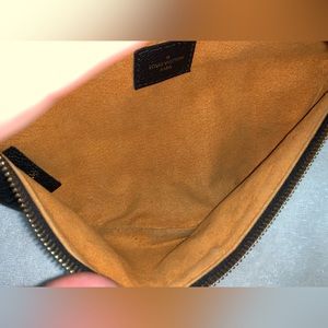 Has light wear on the leather. Inside has some light stains on the inside. Has some fraying threads on the inside lining. No dust bag
