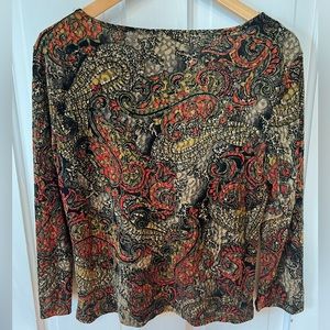 Stretchy, 3/4 sleeve length shirt by Brittany Black. Thin material. Sheer if held up to the light. Gold, olive, and orange colors.
