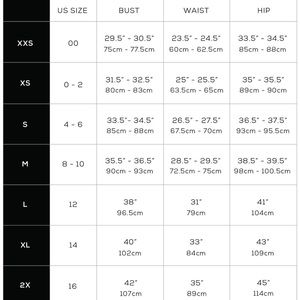 XXS=00, XS=0-2, S=4-6, M=8-10, L=12-14, XL=16 (12W-14W), XXL=18 (16W).