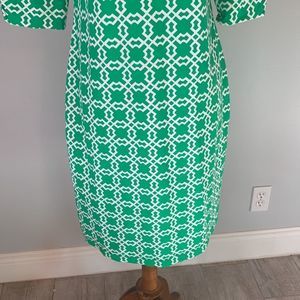 Green and white pattern dress by Katherine Way. Three quarter length sleeves. V neckline. Collar neckline. Stretchy. Just had dry cleaned. Total length measures 38 inches. Size small.