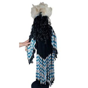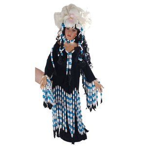 Midnight Moon has been created with love by talented artist Rustie, world famous for her breathtaking costume designs. The wig, clothing and accessories have been carefully chosen to create an elegant and luxurious image, meticulously detailed and lavishly trimmed. She has long black ringlets loose in the back and two braids on either side of her face. Her braids are intertwined with white, blue and silver colored beadwork. The headdress is a stunning feather creation above her headband which displays the same beadwork design, held in place by a silver colored disc. Her dress is faux buckskin draped and edged with the same exquisite beadwork. She is also wearing black faux buckskin pants with laced up moccasin boots
