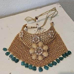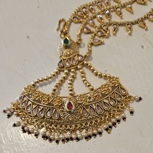 This Indian Bollywood style gold-tone bridal jewelry lot is a stunning addition to any collection. The set includes earrings, necklaces, and headpieces, and more... all made with crystal stones, studded faux diamonds. The multicolor main stones and gold-white color of the lot give it a regal look, perfect for special occasions like engagements, weddings, and anniversaries.