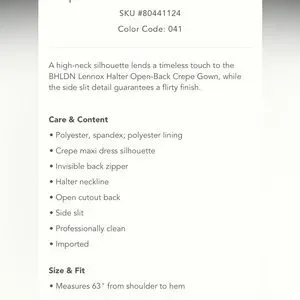 BHLDN Lennox Halter Open-Back Crepe Gown, in navy. Worn once for a wedding then dry cleaned. Hemmed two inches. I am 5’5 and wore 4 inch heels to the wedding and it was long enough.