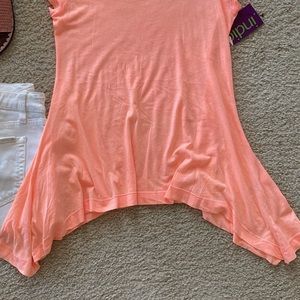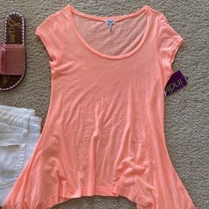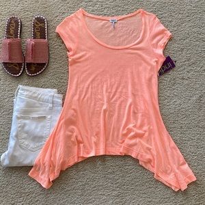 Splendid Short Sleeve Handkerchief Hem Tee. Fabulous wardrobe staple. Peach color. Scoop neck. Short sleeves. Laying flat approx 24” shoulder to hem, approx 15.5” pit to pit. 100% supima cotton. Size XS. NWT.