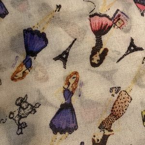 Long Infinity Scarf No Flaws lightweight cotton Paris design with women on it dresses up with hot air balloons and Eiffel Tower print pattern design white with multi colors pink blue yellow and black