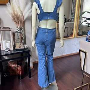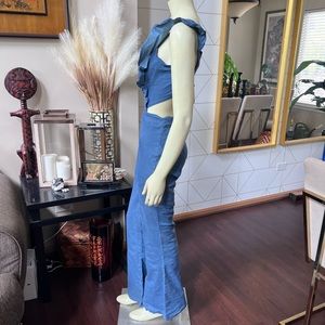 Ruffled Denim Jumpsuits Solid Wide Leg Long Romper