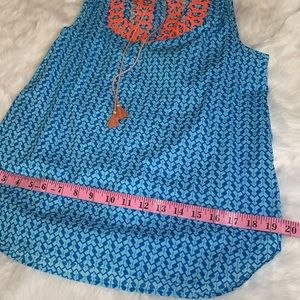 J CREW blue geometric print sleeveless summertime top with bright orange/pink embroidery. Two tassels add a fun detail