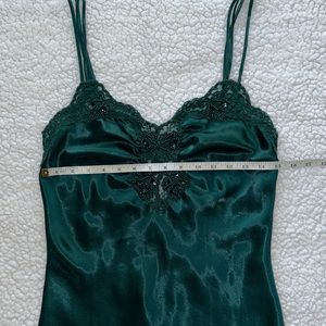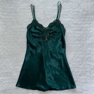 Gold Label Victoria’s Secret vintage VTG emerald forest green, lace, beaded detail, satin finish, slip nightgown nightie lingerie dress, adjustable straps, sheer cut out slit in back, size P (petite for smaller sizing, but please check measurements)