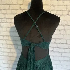 Dark Green Dress. This dress is backless. Has adjustable straps that cross in the back and a strap that is tied in the back to also adjust the fit of the dress. This is a maxi dress (floor length) with a slit that comes up mid thigh. The lining of the dress comes up to where the slit is, so it comes up to the mid thigh. the neck line has a deep v, creating a very beautiful neck line.