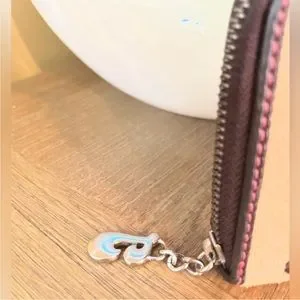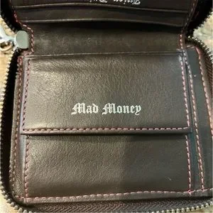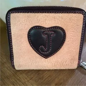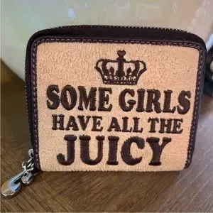 Juicy Couture RARE wallet that zips around. Front of wallet is embroidered in brown lettering SOME GIRLS HAVE ALL THE JUICY with crown. Back of wallet has brown letter heart with J all stitched. Zipper is silver with Letter J pull. When opened it is all brown leather, opening for bills, Juicy Princess credit card holder for a couple of cards and snap coin holder that says Mad Money. Measures 5” wide by 4” high, Cotton and leather. Wallet is in used condition but no rips, tears, or scratches and clean. Outside of wallet (velour) has been washed so not as smooth as when it was brand new condition but still really good condition. Please note that wallet is not as pink as picture more very light pink/tan as seen in last picture.