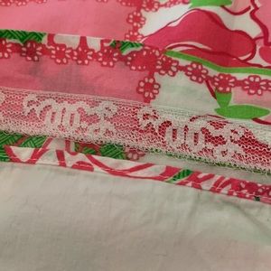 Lilly Pulitzer strapless sheath dress / sundress with hidden side zipper and lining. Has boning in the bust as well as the rubber around the top of the dress to hold it in place. This print is adorable! It has butterflies, stripes, and florals in Barbie pink, magenta, lime green, and white. The patterns are in a windowpane / quilted style print. The back has a cute knot tie.