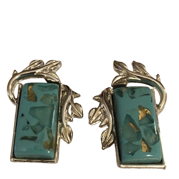 Vintage Coro Confetti Turquoise Lucite Clip On Earrings Gold Flakes Silver Tone
