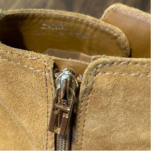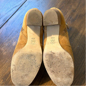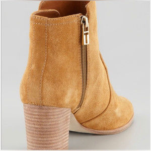 Tory Burch Sade bootie Suede; golden hardware. 4" ankle-high shaft. 2 1/2" stacked block heel. 11" circumference opening. Interior zip with "T" logo pull. Signature Tory Burch double-"T" logo charm at side. Round toe. Leather lining and sole. "Sabe" is made
