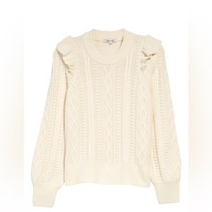 Madewell Hollydene Ruffle Sleeve Wool Sweater. 22.5” long. 17” across the bust. 60% Merino Wool. Very light pink spot on left shoulder ruffle as shown. Otherwise in great condition. Size XS