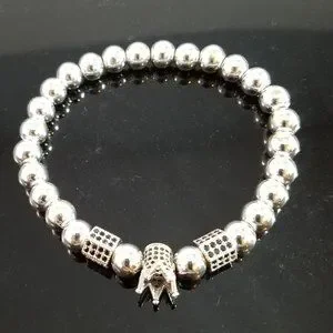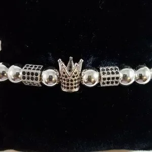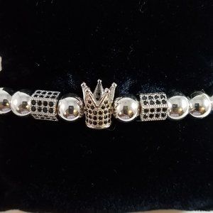 This handmade bracelet is made of 8mm silver stainless steel beads, 2 hexagon pave beads and one pave crown. The rhinestones are black. It is a handcrafted stretch bracelet. Without any stretch it measures 7.5". So it fits 7"- 8" wrists.