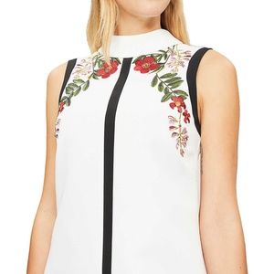 Add some fresh florals to your white hot style with this chic little frock from Ted Baker! The classic shift dress is given a refreshing upgrade with a delicate embroidered design and black trim. The perfect combination of vintage flare and modern feminine style. Go for a mod-inspired look when you pair this piece with some sleek Mary Janes and a chunky headband.