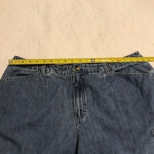 Gloria Vanderbilt blue denim shorts. Has belt loops and 4 pockets (2 in front, 2 on the sides—see pics). 100% cotton (size 20W). Measurements in pics. Machine wash warm, tumble dry low. Well-worn, in decent shape (see pics for wear spots). Fun summer shorts!