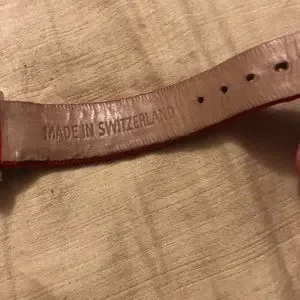 Beautiful Emporio Armani watch with red leather watch band mother of pearl face with 11 small diamonds inside.. needs new battery does not have its original box.