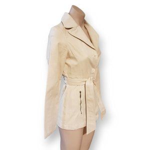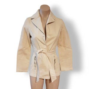 Metrogirl Y2k, cream / light tan, button up, stretch denim corduroy jacket / coat with removable belt and bronze metal zippers on pockets.