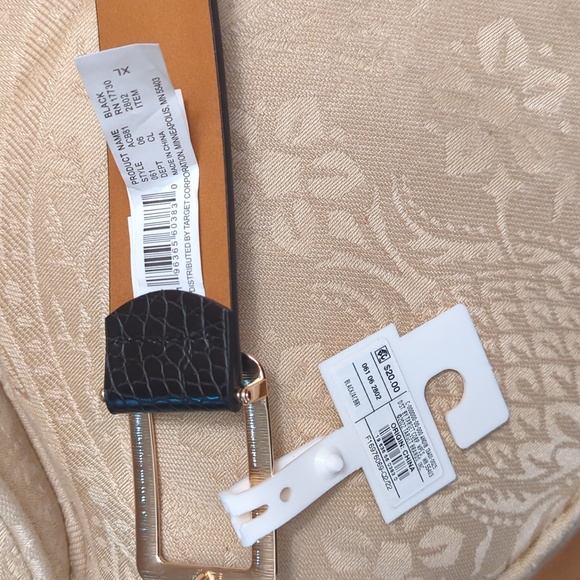 New with tags. A New Day XL Black PU/Bonded Leather Belt. Gold colored buckle. Total belt length from buckle tip to the belt end is 46 inches, about 1.5 inches in width. See pictures for details. Smoke free and pet free home. Has reptile style print.