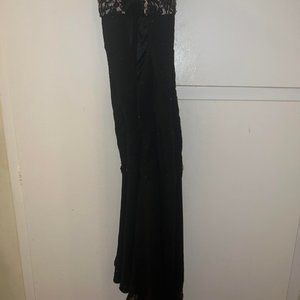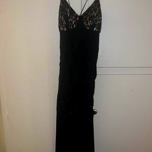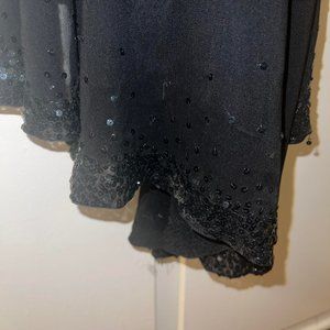 Size is Small Petite, but the dress does drape long. Can work nicely with 3-5 inch heels (I stand at 5'2" to give some perspective). There is sequin on the bottom of the drape and some details on the brassiere as well and middle of the dress as well. Black with gold accents at the top. Zips up.