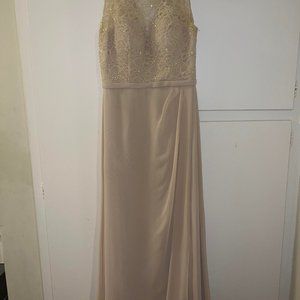 Worn only once for a wedding as a part of the Bridesmaid party. Custom tailored at the bottom to show shoes instead of drape over them like the originally dress. Jeweled accents and floral pattern at the brasserie. Buttons and zips up in the back. Originally purchased at $200 not including the tailoring. True to size.