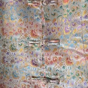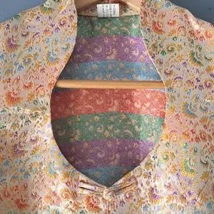 Silk blend (80% Silk/20%Viscose) top with interesting neckline and lovely knot button closure. Measures approx 18" across chest and 20 1/2" -22 1/2" from back of neck to hi-low hem.
