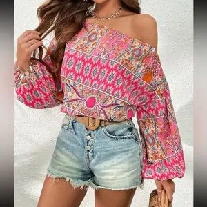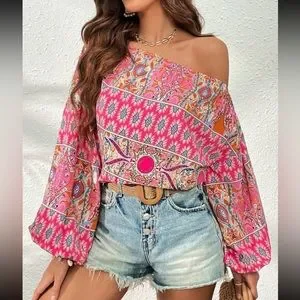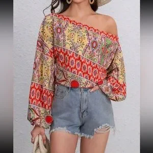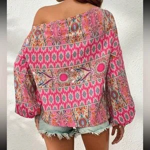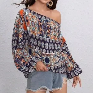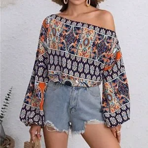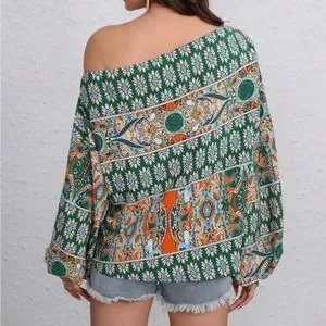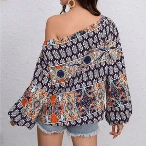 Boho floral print off shoulder lantern sleeve blouse