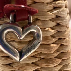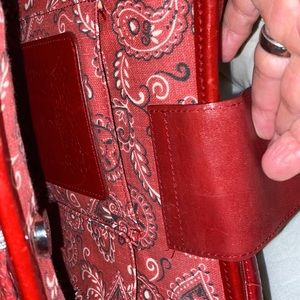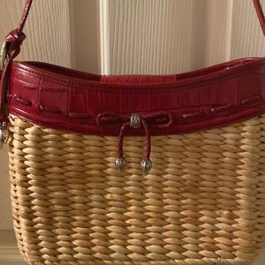 A cute Brighton purse straw with red leather. Inside of purse is red bandana with cell phone pocket and smaller pocket. In excellent condition no stains or tears!! Width is 10 x 8 length. Strap to bottom of purse 22 inches.