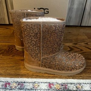 A glittery finish dappled with leopard spots elevates the must-have appeal of a classic boot lined with UGGplush and set on a cushiony TreadLite by UGG sole. UGGplush is a moisture-wicking textile made from a wool-rich blend but crafted to feel and wear like genuine shearling.