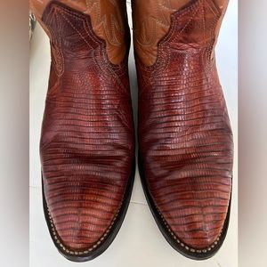 These are exquisite! I’ve seen a lot of vintage boots and these are in beautiful shape. Brand is Nocona, which happens to be in the Justin boot family. Nocona is known for their custom boots. These are exotics, lizard and calf leather. Size men’s 8, would fit a women’s 9.5. The lizard hide is in fantastic shape, the 12” calf upper is super soft. The heels show almost no wear, and the piping on the sides is not cracked or missing. I use Saphir brand leather products for exotic leathers. Inside boot says imperfect but I’ve not seen anything on the inside or outside which is off. There is a tiny hole at top of boot where it looks like it was pierced. Almost imperceptible. See photos, yellow arrows. Please go through the detailed photos. I’m happy to answer any questions. I’ve already discounted shipping. These are fabulous boots in nearly new condition. Non smoking home. I have a Justin box I can ship these in. There are sizing charts online for Nocona for reference. Reasonable offers considered.