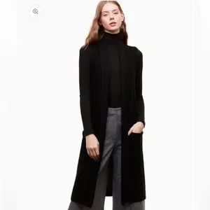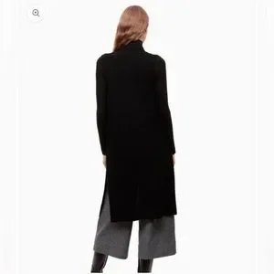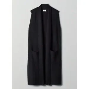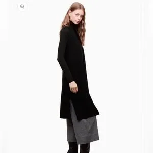 Never before worn item with tags removed. This is a long, sleeveless, robe-style cardigan with front patch pockets. It’s knit with Italian-spun merino wool. Color is a heathered black. Gives grey undertones.