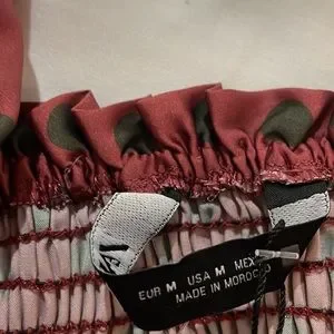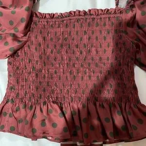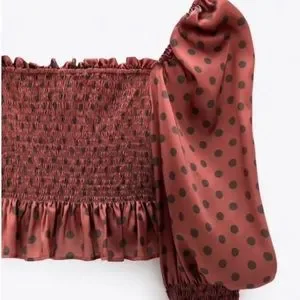 NWT Zara Satin Burgundy Red & Green Polka Dot Smocked Puff Sleeve Top in size M