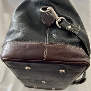 All black/brown leather; rivets secure the attachment of the brown padded handles; zipper closure on top with pull tab; black nylon lining has large zipper pocket on inside; adjustable shoulder strap can be worn on shoulder or crossbody has shoulder pad for comfort that slides up and down. Also, swivel clips for attachment. Brown bottom has silver studs for protecting the bottom of your bag. The bag is all double stitched. I bought 2 so when one wears out I have another this has been in my closet. The first one is still going strong âŁïž