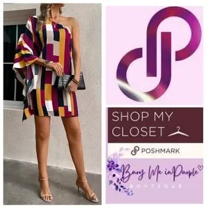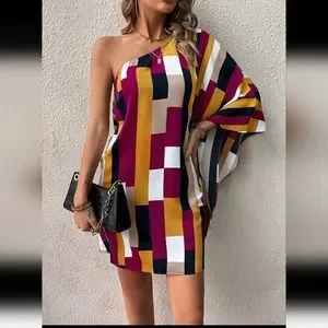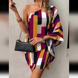 Geometric print with one shoulder, batwing sleeve. Lightweight Polyester.